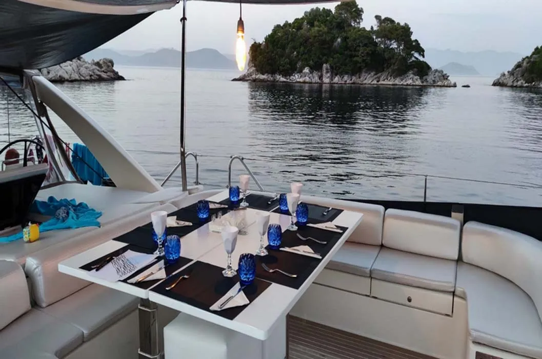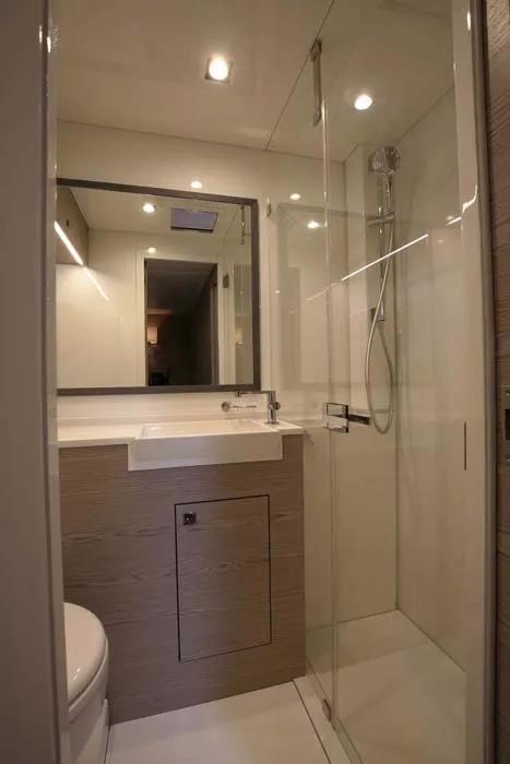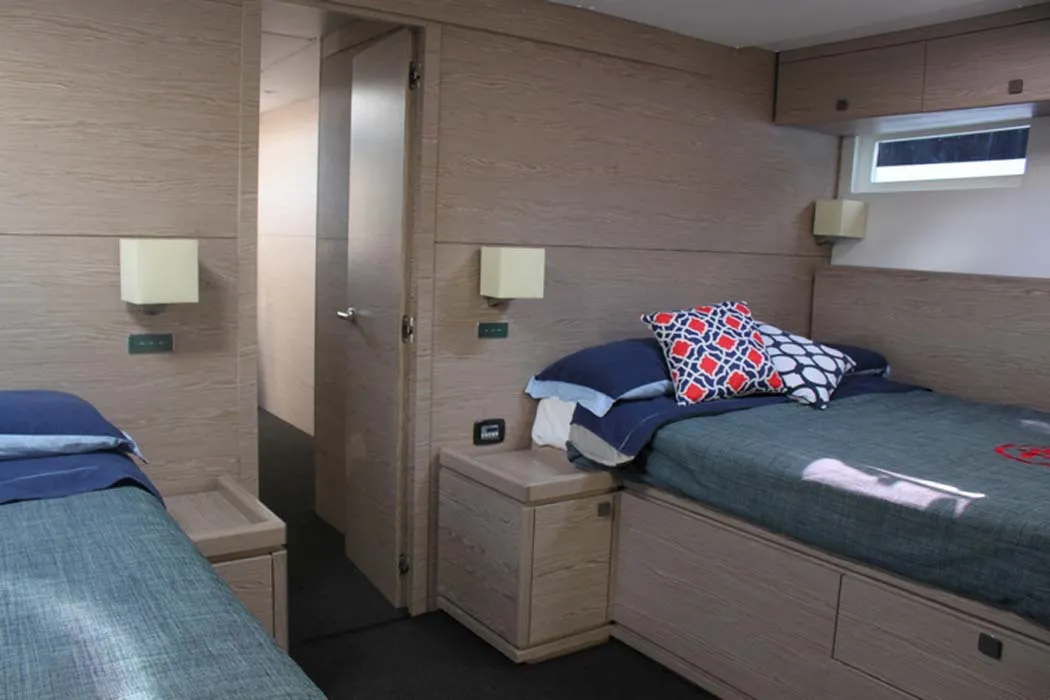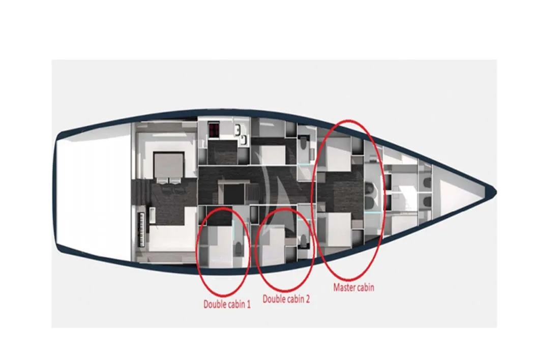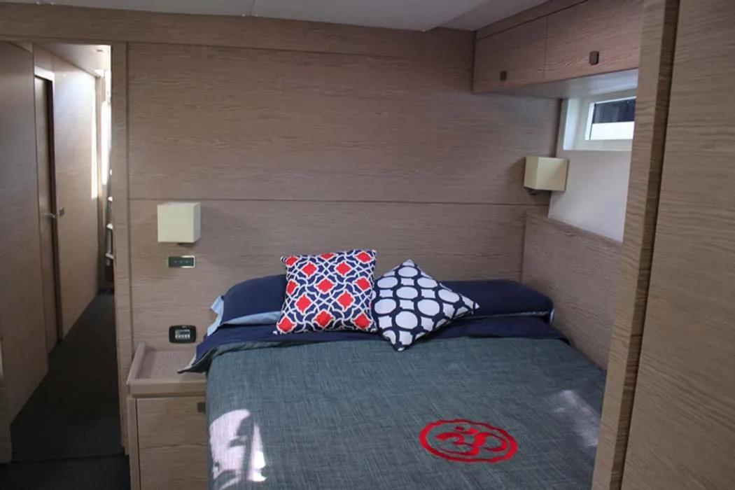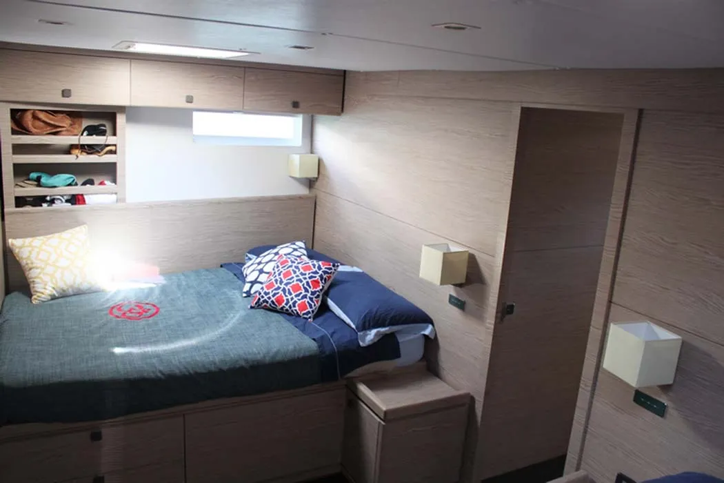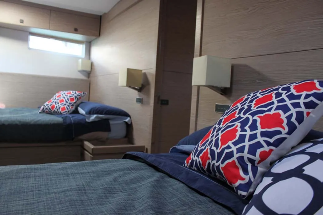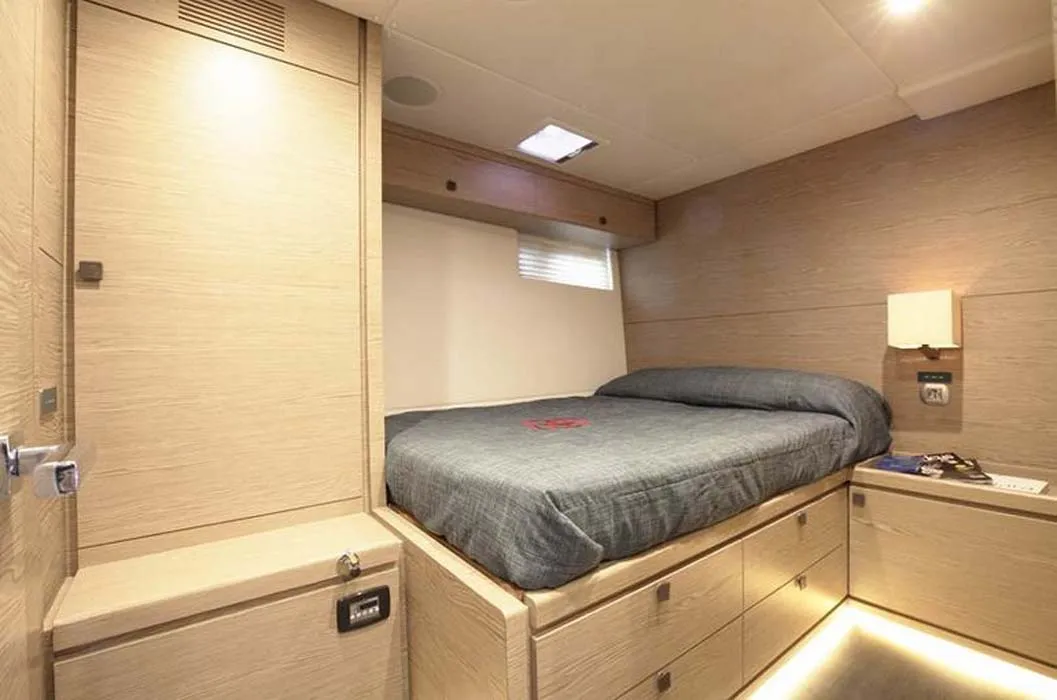 A poppavia si colloca la doppia timoneria dalla quale l’armatore può avere il pieno controllo di tutta l’imbarcazione grazie anche ai sistemi di Vismotica e godere a pieno della navigazione d’altura. Può ospitare fino a 8 ospiti, proposta con 3 membri d’equipaggio attenti ad ogni dettaglio.