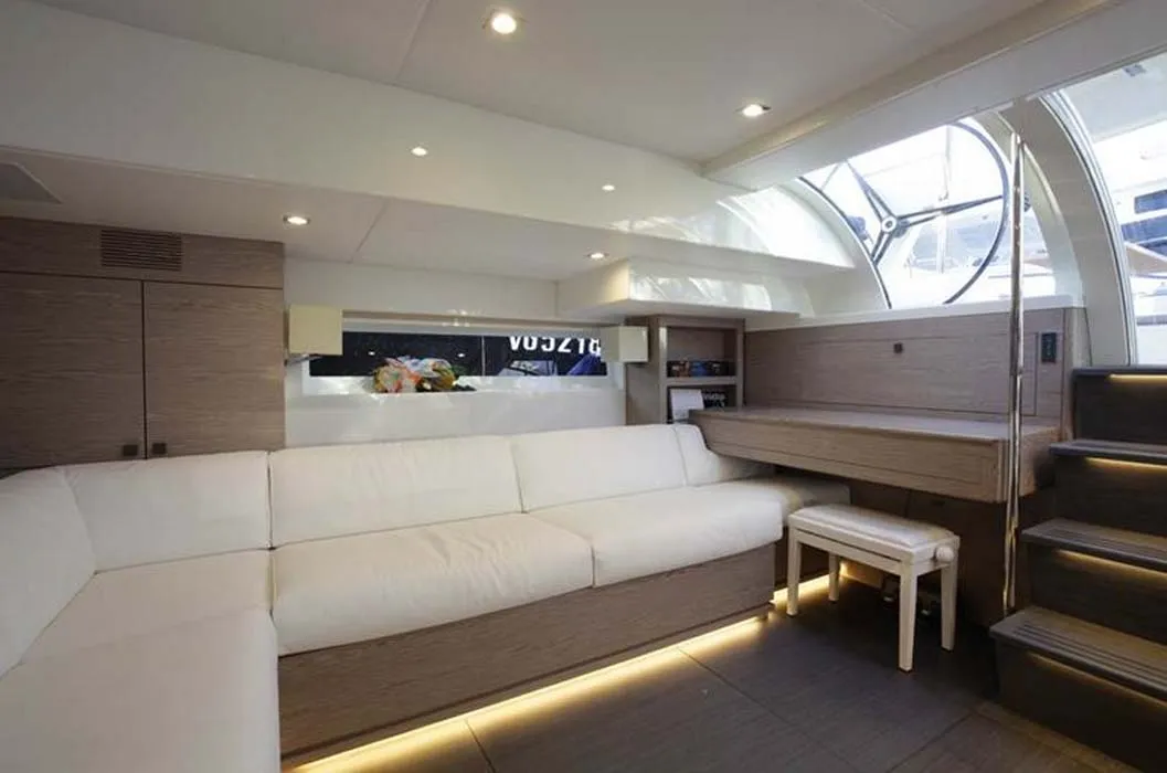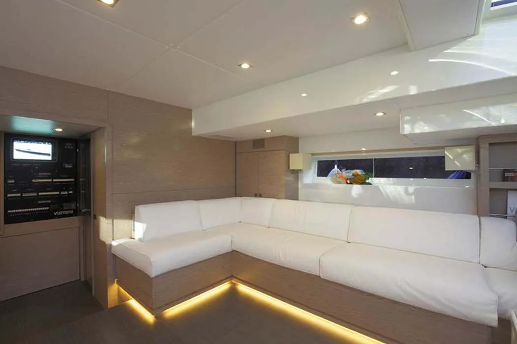 Il favoloso flybridge è interamente dedicato agli ospiti che potranno così godere in comfort la navigazione, protetti dagli spruzzi e dal vento in ogni andatura e godere del sole grazie all’ampia cuscineria prendisole, in una struttura che sovrasta il bellissimo ponte in teak. Dall’area lounge si potrà accedere sotto coperta attraverso un ingresso dedicato.