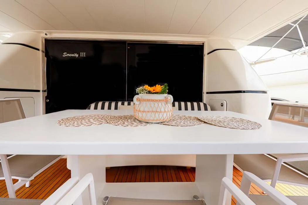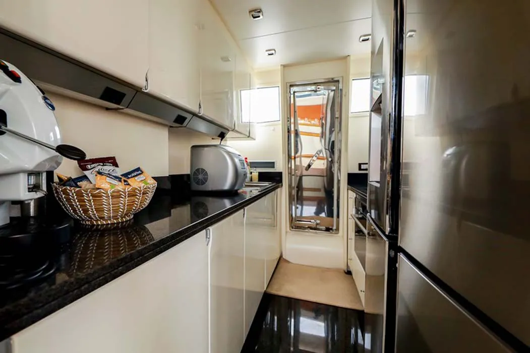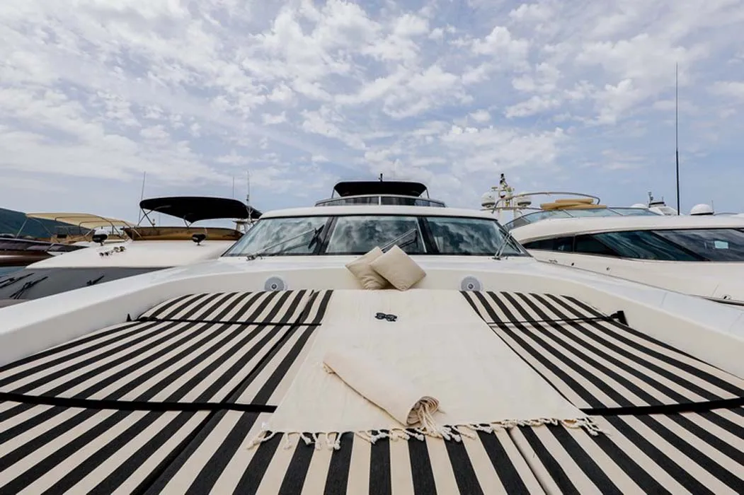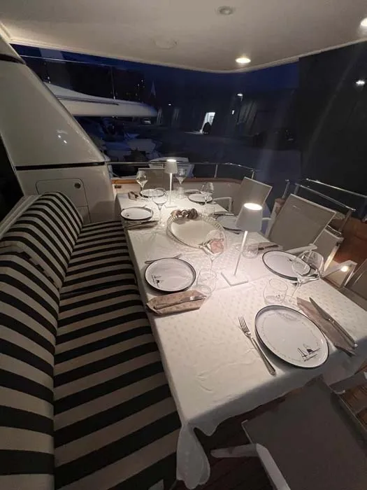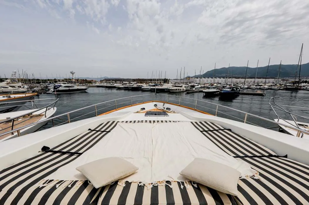 Dispone di 4 comode cabine: 2 matrimoniali (master e vip), 1 singola (divano letto), 1 tripla con letto pullman per un massimo di 8 ospiti. Flybridge spazioso, equipaggio altamente professionale di 3 persone.