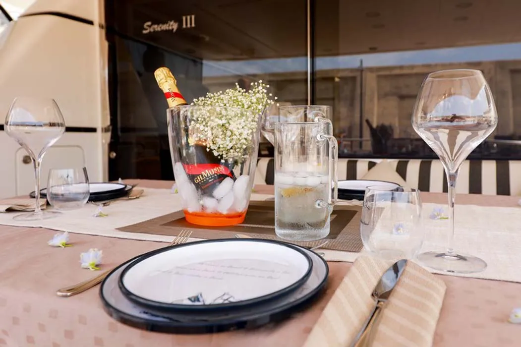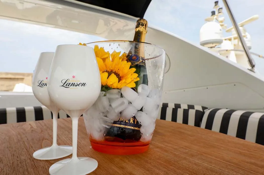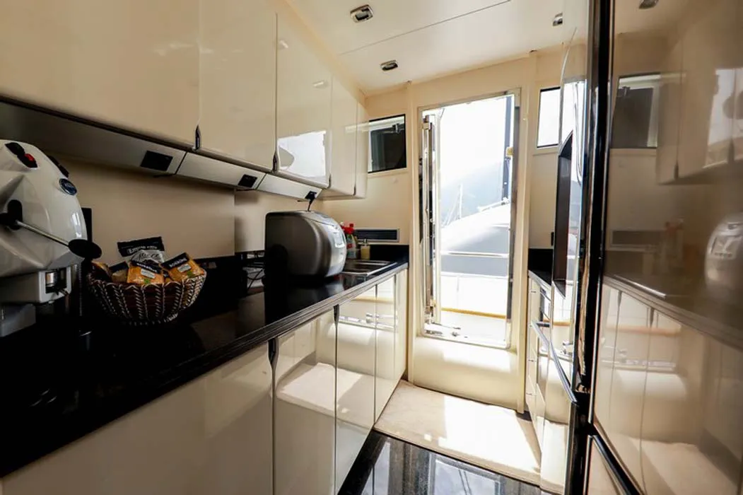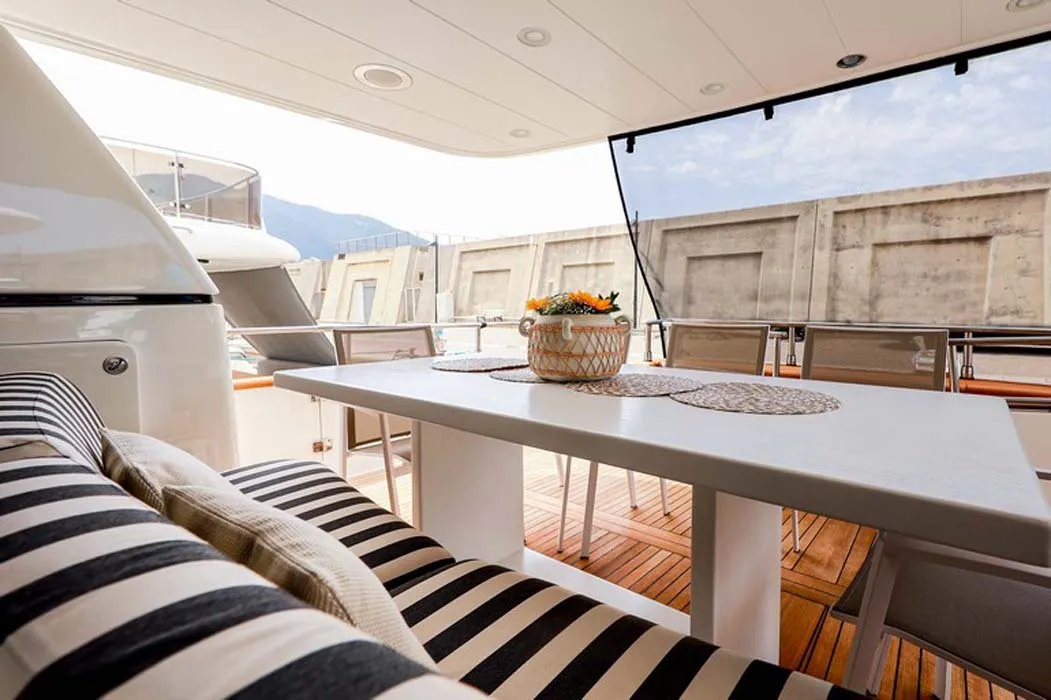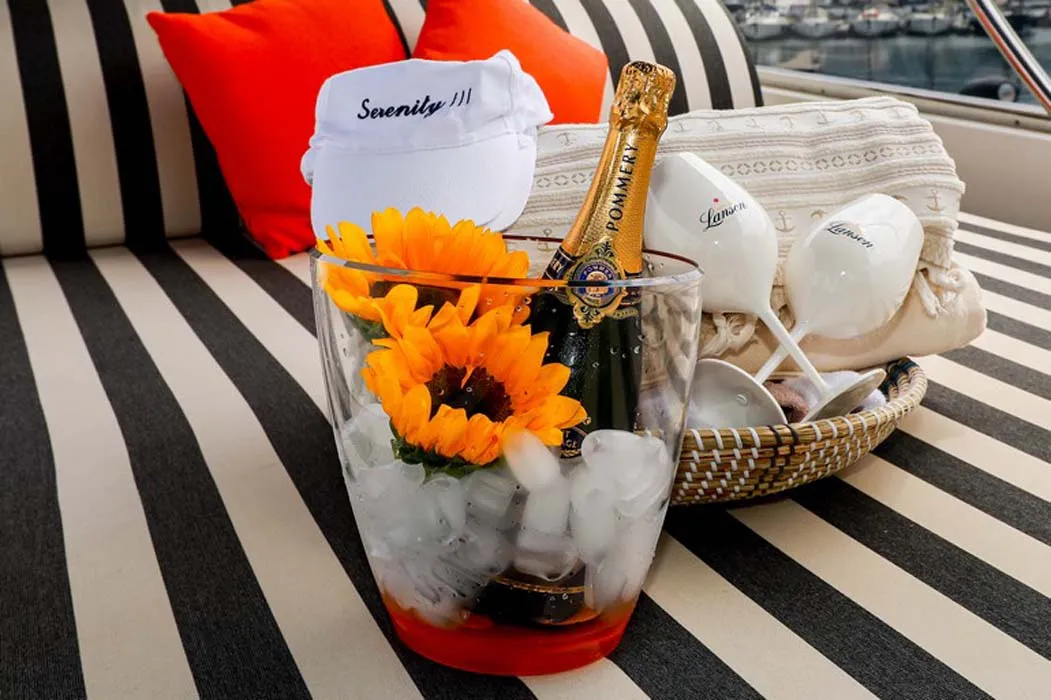 Dispone di 4 comode cabine: 2 matrimoniali (master e vip), 1 singola (divano letto), 1 tripla con letto pullman per un massimo di 8 ospiti. Flybridge spazioso, equipaggio altamente professionale di 3 persone.